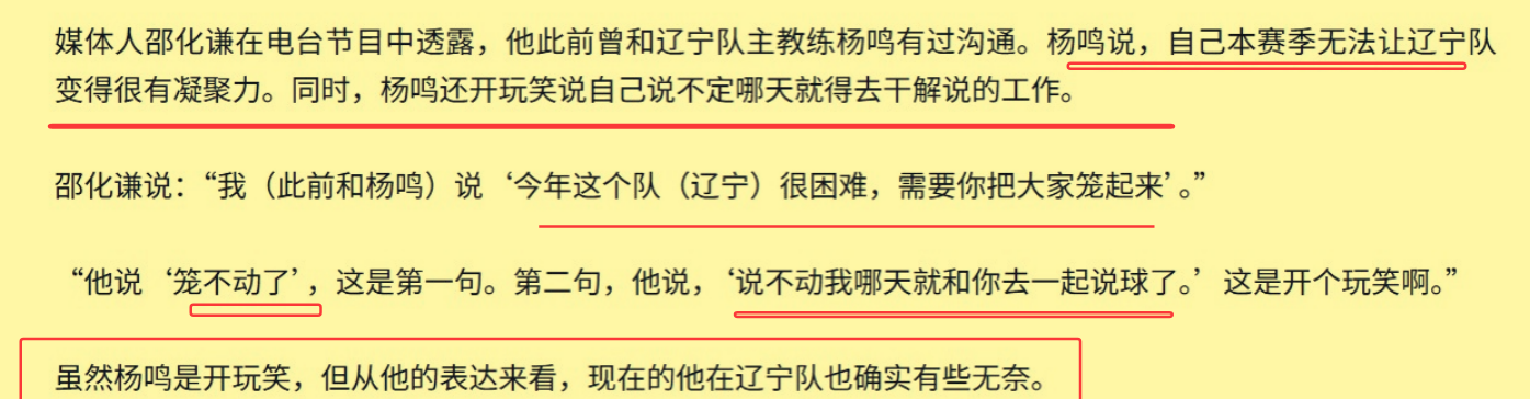 应该说杨鸣早就有这方面的准备了,根据名嘴邵化谦的爆料,他说冠军教头杨鸣在跟他聊天时透露过自己的无奈,表示这个赛季无法让辽篮变得更有凝聚力,笼不动了。还开玩笑说,说不定哪天就去干解说了。